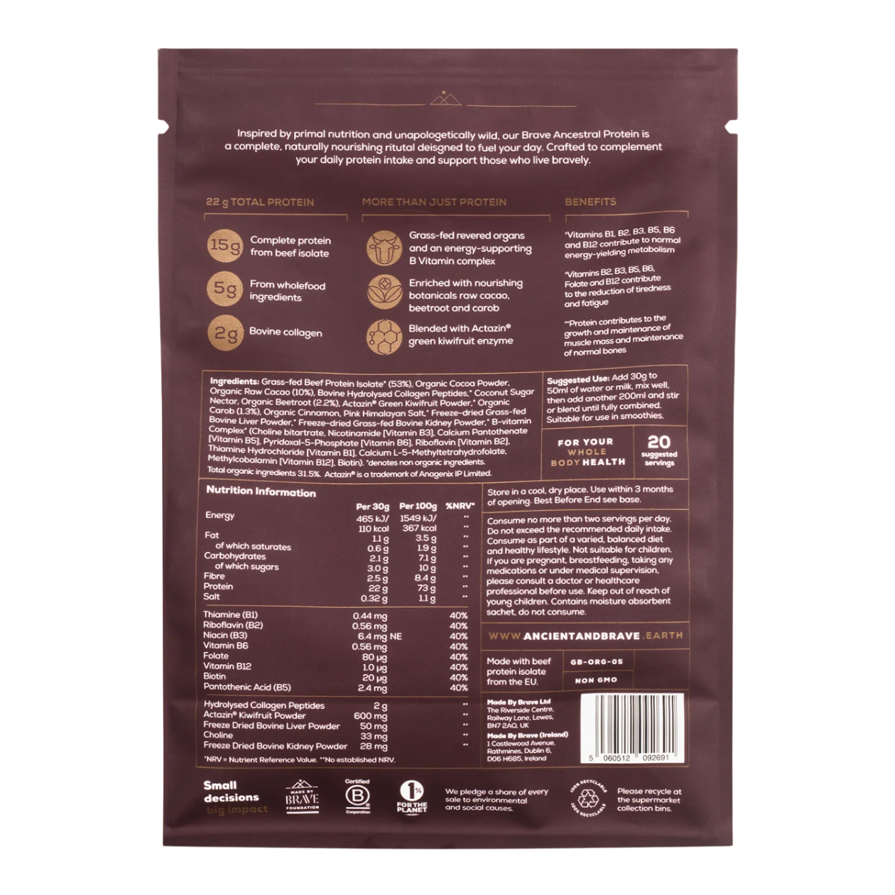 A complete protein blend combining grass-fed beef protein isolate with collagen peptides, freeze-dried liver and kidney, methylated B-vitamins and cacao – delivering 22g protein per serving to support strength, energy and whole-body vitality.