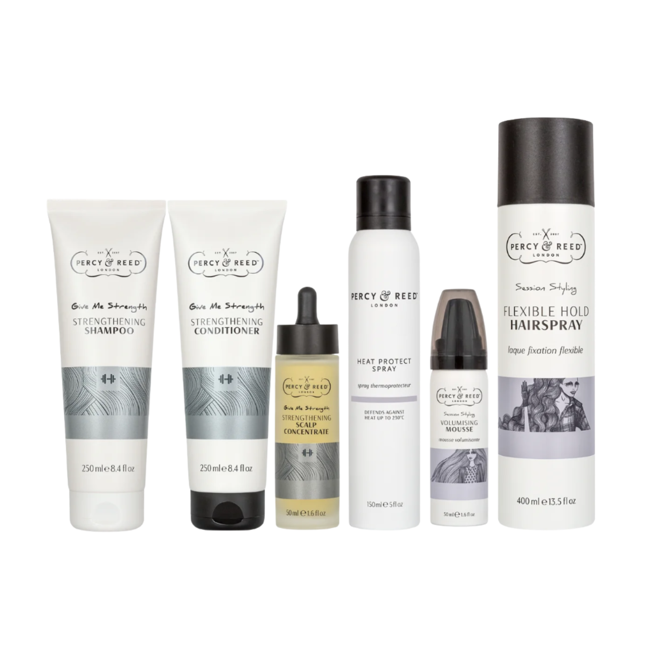 A six-piece collection designed to nourish, strengthen and style even the finest hair. Includes the Give Me Strength Shampoo, Conditioner and Scalp Concentrate, plus the brand new Heat Protect Spray, a volumising mousse and hairspray for complete styling from wash to finish.